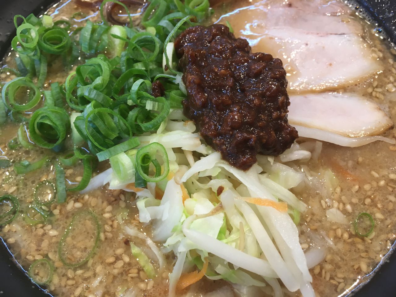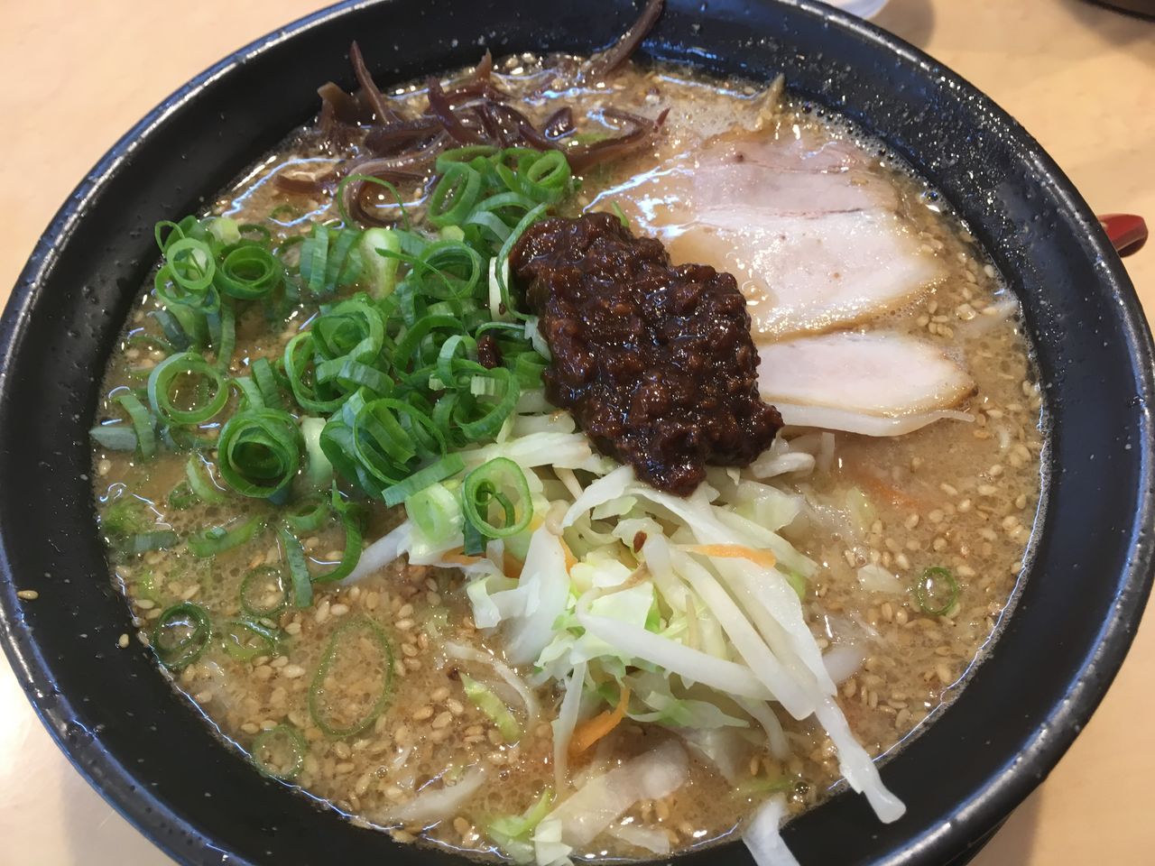 餃子完食からやや待つぐらいのタイミングで、濃厚とんこつ味噌ラーメン到着! こちらでラーメンを頂く度に驚くのが丼の小ささ。(念のため、中身が少ないわけではない)味噌ラーメンも小ぶりの丼であったが、黒色の丼を使用されているだけで見た目が華やかになりますね。