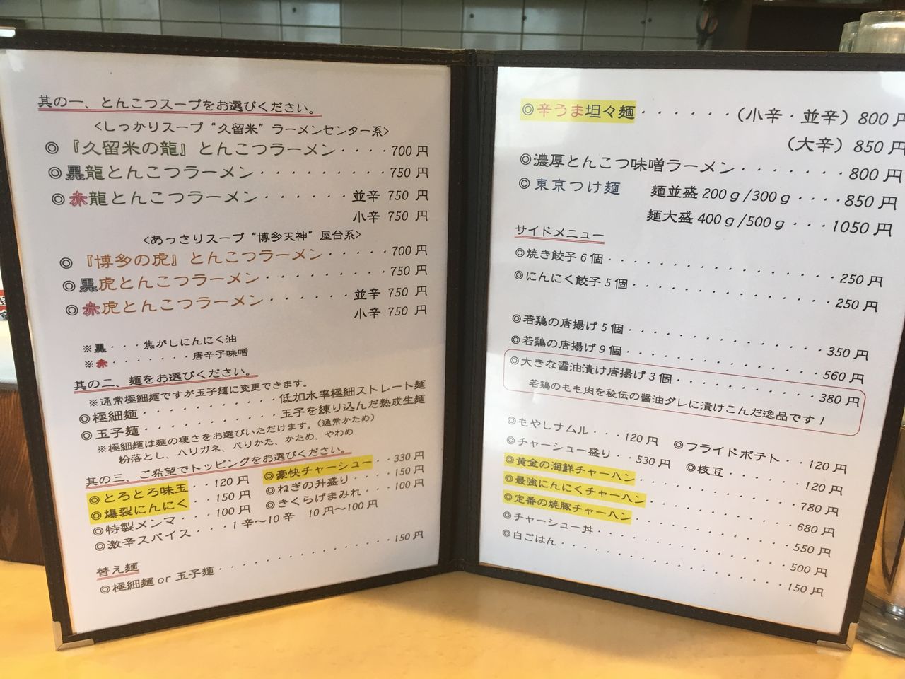 さて、メニュー。何しろ、とんこつラーメンが好きで訪ねているお店。悩みつつも欠かさずとんこつラーメンメニューをオーダーしているのだが、ようやくスイッチが入り本日は別メニュー、濃厚とんこつ味噌ラーメン800円をオーダーした。